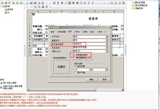 打开单据,点击“打印”—“打印模版设置”,单击选择需要设置的单元格,点击右键,选择“设置单元格格式”,打开“对齐”的页签,将“自动缩放填充”打上勾即可。设置之后字段内容会根据单元格大小自动缩放填充显示全部内容。