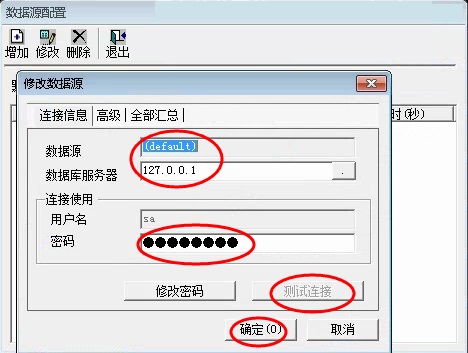 3、此时会出现数据源配置界面,数据源处输(default),数据库服务器输127.0.0.1,在密码处需要输入SA口令,SA密码就是把你的数据库密码输入好,点击测试连接,测试通过后,点击确定,如下图所示: