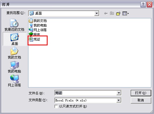 e. 选中之前导出到电脑桌面的凭证excel表,如下图所示: