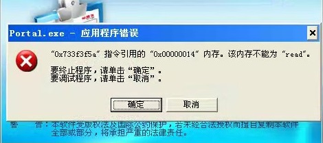 然而点击确定后仍然提示:Portal.exe应用程序错误:"0x733f3f5a" 指令引用的 "0x00000014" 内存。该内存不能为 "read"又该如何解决呢?下面用友财务软件教程网站将一一为您分析: