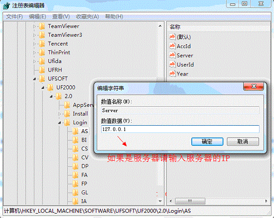 (3)服务器配置有误,导致计算机找寻服务器IP地址时间过长,提示内存不能为"read"的错误。此类情况需要修改注册表值,操作方法如下:开始---运行---regedit---HKEY_LOCAL_MACHINE---SOFTWARE----UFSOFT----UF2000----2.0----Login。鼠标右键“修改”把login下每一项有server的值都改成服务器的IP地址。【如果是单机版请直接修改成127.0.0.1,如果是客户端请修改成服务器的IP地址。如果不明白如何查看服务器的IP地址,请访问:怎么查看服务器的IP地址?】