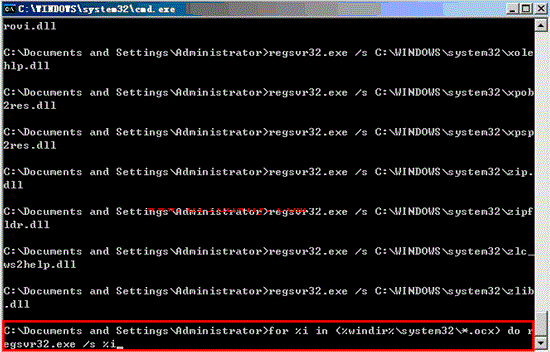 for %i in (%windir%\system32\*.ocx) do regsvr32.exe /s %i 然后回车,等待操作系统注册完毕。