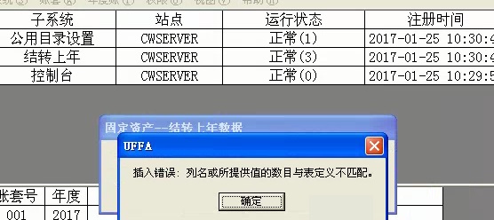 用友T3财务软件年结小问题,固定资产结转上年数据时,提示插入错误,列名或所提供值的数目与表定义不匹配。