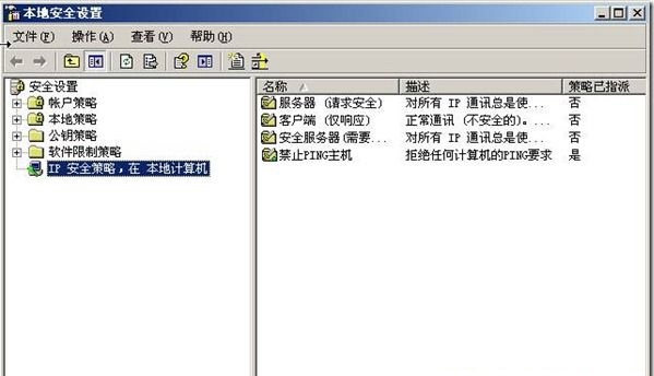安全策略创建完毕后并不能马上生效,我们还需通过“指派”功能令其发挥作用。右击“本地安全设置”对话框右侧的“禁止Ping主机”策略,执行“指派”命令,即可启用该策略。