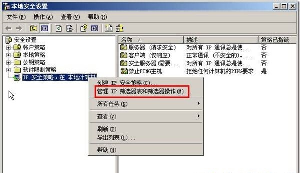 (2)右击该对话框左侧的“IP安全策略,在本地计算机”选项,执行“管理IP筛选器表和筛选器操作”命令;
