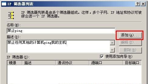 (3)在弹出对话框的“管理IP筛选器列表”标签下单击[添加]按钮,命名这个筛选器的名称为“禁止Ping”,描述语言可以为“禁止任何其他计算机Ping我的主机”,单击[下一步];