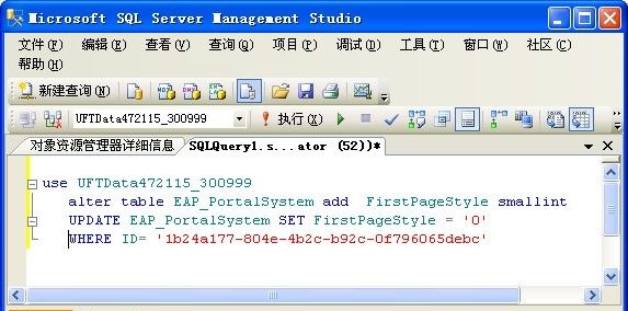 注意:上面的语句是在EAP_PortalSystem表中增加FirstPageStyle字段,并给他相应的值,在操作时需要注意是不是缺少这个字段,并注意对应的账套号,字段值等。
