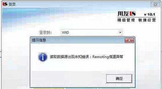 今天在给一个用友软件爱好者安装用友U8V10.1软件时,前面的安装教程都很正常,包括数据库安装,环境检测等,安装完成重启电脑后,配置好数据源,登录系统管理,提示:读取数据源出现未知错误:Remoting信道异常?