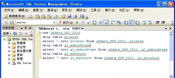 2、查看使用的用友软件其他账套是否正常,如果其他账套正常,那么可能是此账套数据库问题,假设正常的账套是999号账套2011年度,打印不了总账表头和尾的账套是001账套2013年度,那么在数据库中执行列语句(温馨提示:操作前请备份好数据,建议由用友工程师协助操作)。