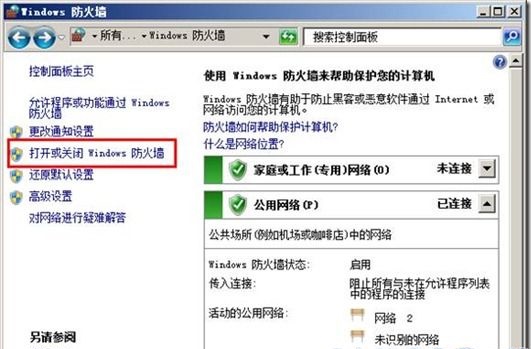 (2)先点击“打开或关闭windows防火墙”将windows防火墙打开,如下图所示: